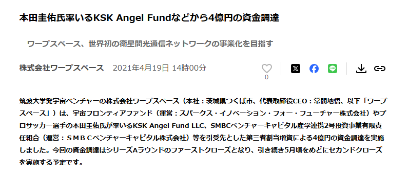 さらに、宇宙通信インフラを構築する「ワープスペース」への出資も話題になりました。