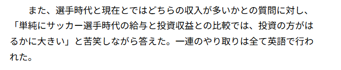 投資の利益はサッカー選手時代よりはるかに大きいと発言