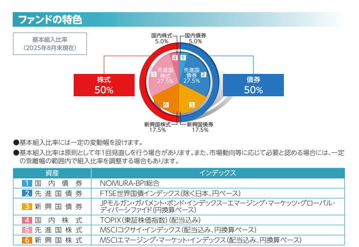 オルカンやS&P500のような株式100%ファンドと違い、債券が半分入っているのが特徴です。