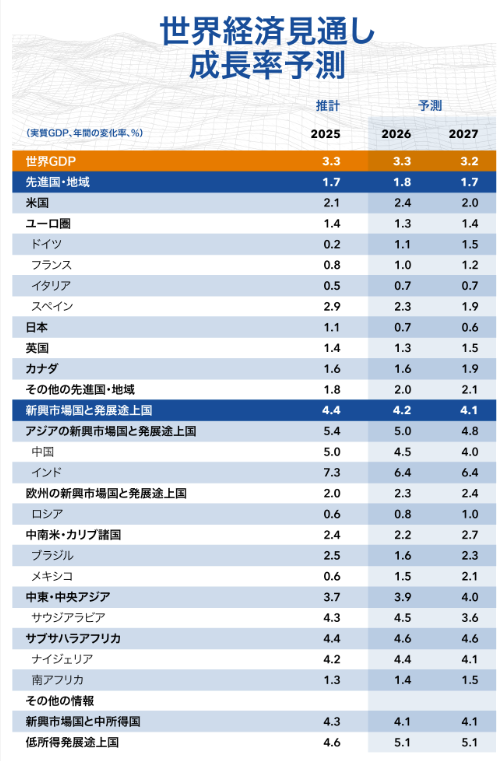 IMFが2026年1月に公表したデータによると、世界の実質GDP成長率は2025〜2027年にかけておおむね3.3%前後の安定した成長が見込まれています。