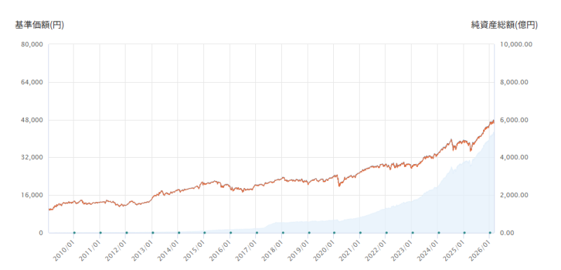 2009年の設定以来、基準価額は1万円から4万円台後半へと着実に伸びています(2026年3月時点)。