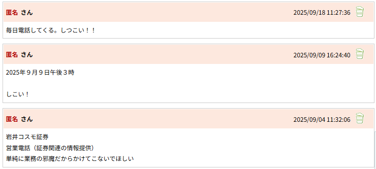 - 岩井コスモ証券の「営業電話がしつこい」という報告はある