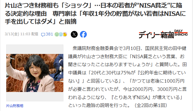衆議院の委員会で、片山さつき財務大臣が「NISA貧乏」という言葉に触れ、ショックを受けたと答弁したほどです。