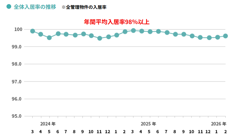 日本財託では管理戸数が30,000戸以上の規模にもかかわらず、98%以上という驚異的な入居率を維持しています。