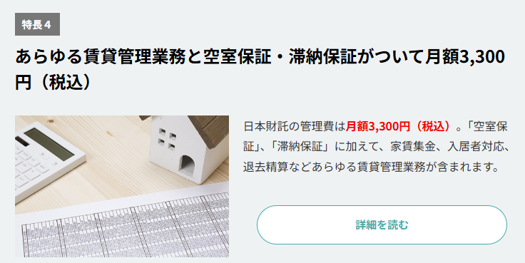 通常は「家賃の5%」程度かかる管理手数料が、一律3,300円(税込)という定額制なのも、日本財託のユニークなポイントです。