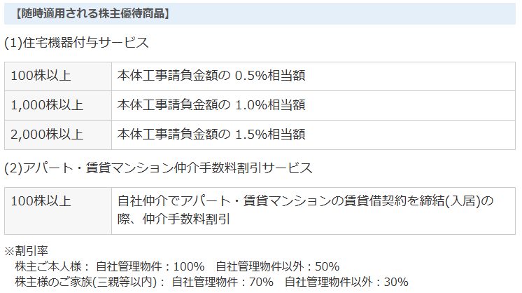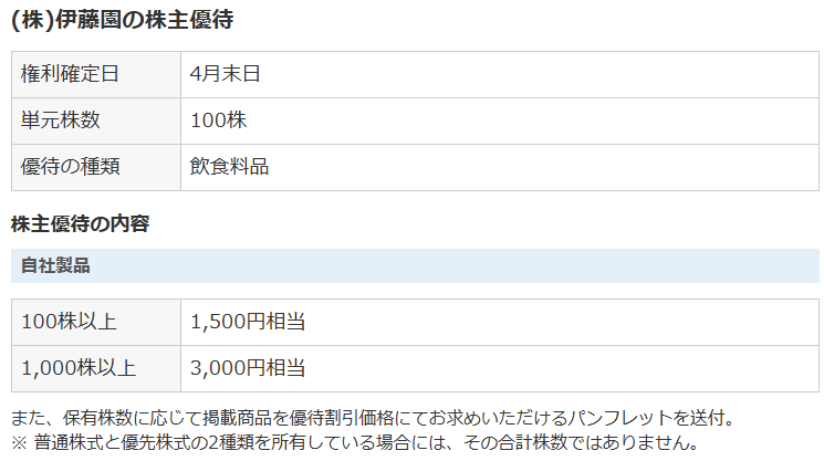 株主優待としては、100株以上保有者には1,500円相当(1,000株以上の保有者には3,000円相当)の自社製品詰め合わせが贈呈されます。