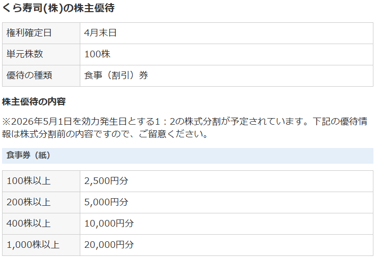 優待として、100株保有で2,500円分の優待券が提供されます。
