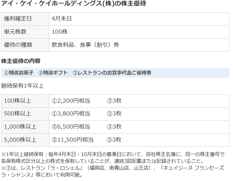 アイ・ケイ・ケイホールディングス(2198):特選お菓子やレストラン優待券がもらえる【4月末権利確定】