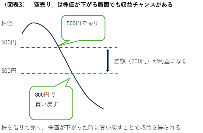 例えば、信用売り(空売り)でA社の株を借りて500円で空売りし、株価が300円まで下がったときに買い戻せば、安い時(300円)に買って株価が上がったとき(500円)に売る取引をしたようなものとなります(図表3)。
