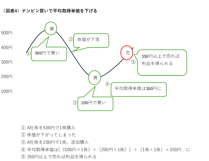 ナンピン買いとは、株価が下がったときに追加投資をして、保有する銘柄の平均取得単価を下げる投資手法です。