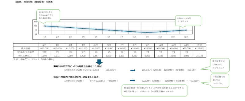 定期的に一定の金額ずつ買い続けることで、価格が安いときには量を多く、価格が高いときには量を少なく購入することになり、購入単価を平準化できます(図表5)。