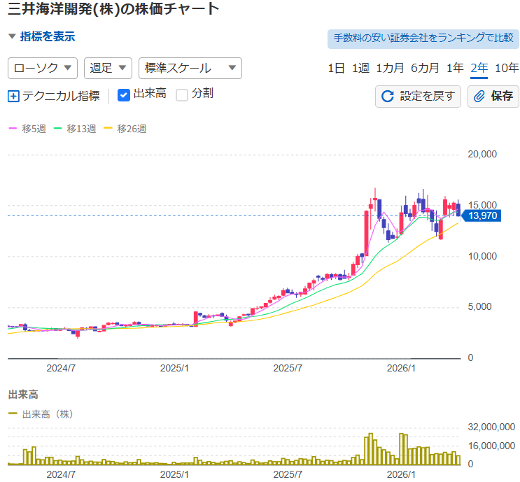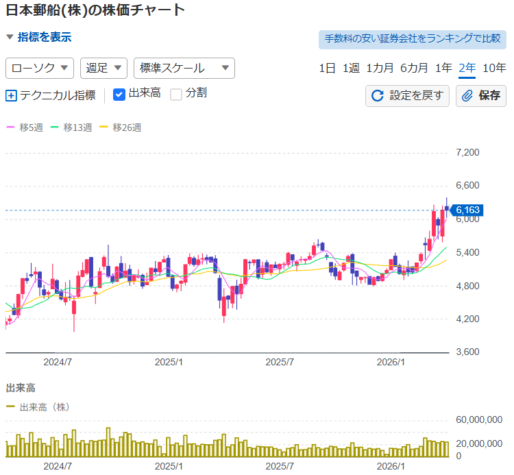 ただし、本業の海上輸送はコンテナ船市況などの外部要因による業績の振れ幅が大きく、純粋な海洋資源テーマだけで株価が動くわけではない点には注意が必要です。
