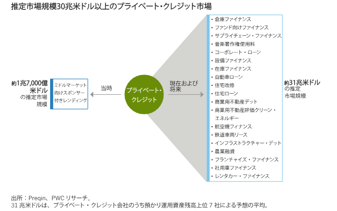 プライベートクレジットの市場規模は現在280兆円(約1.5兆〜2.1兆ドル)に達し、将来まで加算すると推定31兆ドルの規模があるとされています。