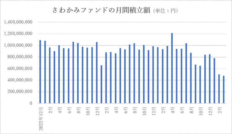 資金フローでもう1つ懸念されるのが、さわかみファンドの積立投資によって流入する金額がここ数ヵ月で大きく目減りしている点です。