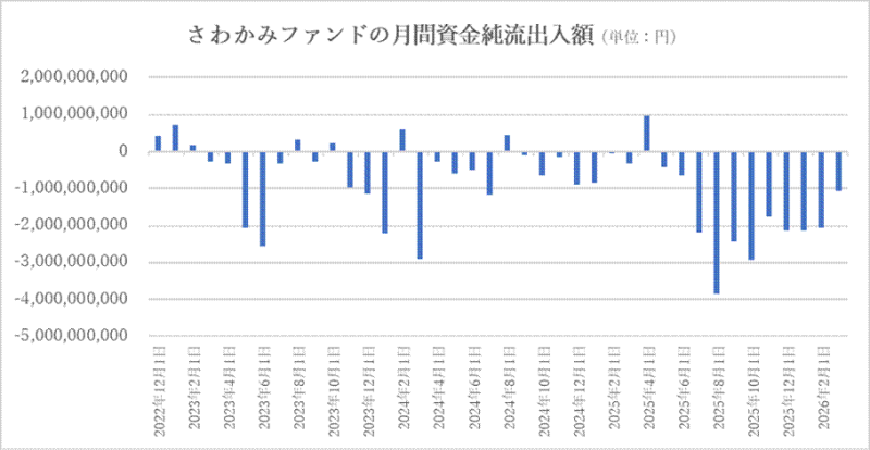 そこで買付日における資金流入額を見ると、2025年7月までは毎月コンスタントに10億円前後の資金流入額を続けていましたが、2026年に入ってから急減しており、3月の買付日における資金流入額は4億7,762万4,601円にまで目減りしています。