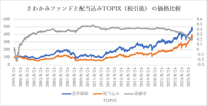 さわかみファンドの基準価額と、配当込みTOPIX(税引後)の推移と、その乖離率を計算してみました。