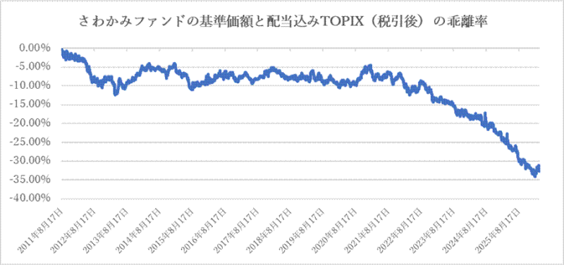 すると、継続的にマイナス乖離、つまり、さわかみファンドの運用成績が、配当込みTOPIXに負け続けていることがわかります。