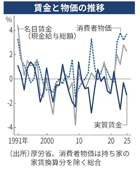 - 「給料は上がっても、物価高に追いつかない」という実質賃金の低下