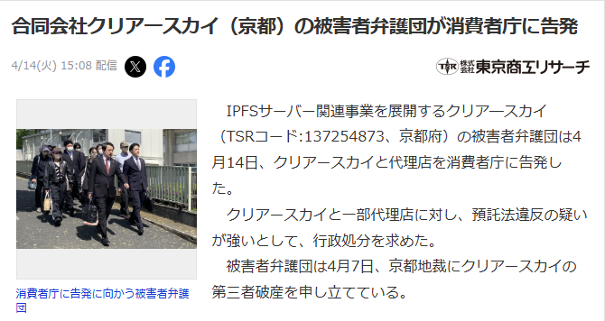 2026年4月14日、弁護団は消費者庁へクリアースカイや代理店に対する告発状を出しました。