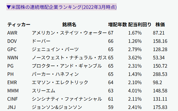 ▼米国株の連続増配企業ランキング(2022年3月時点)